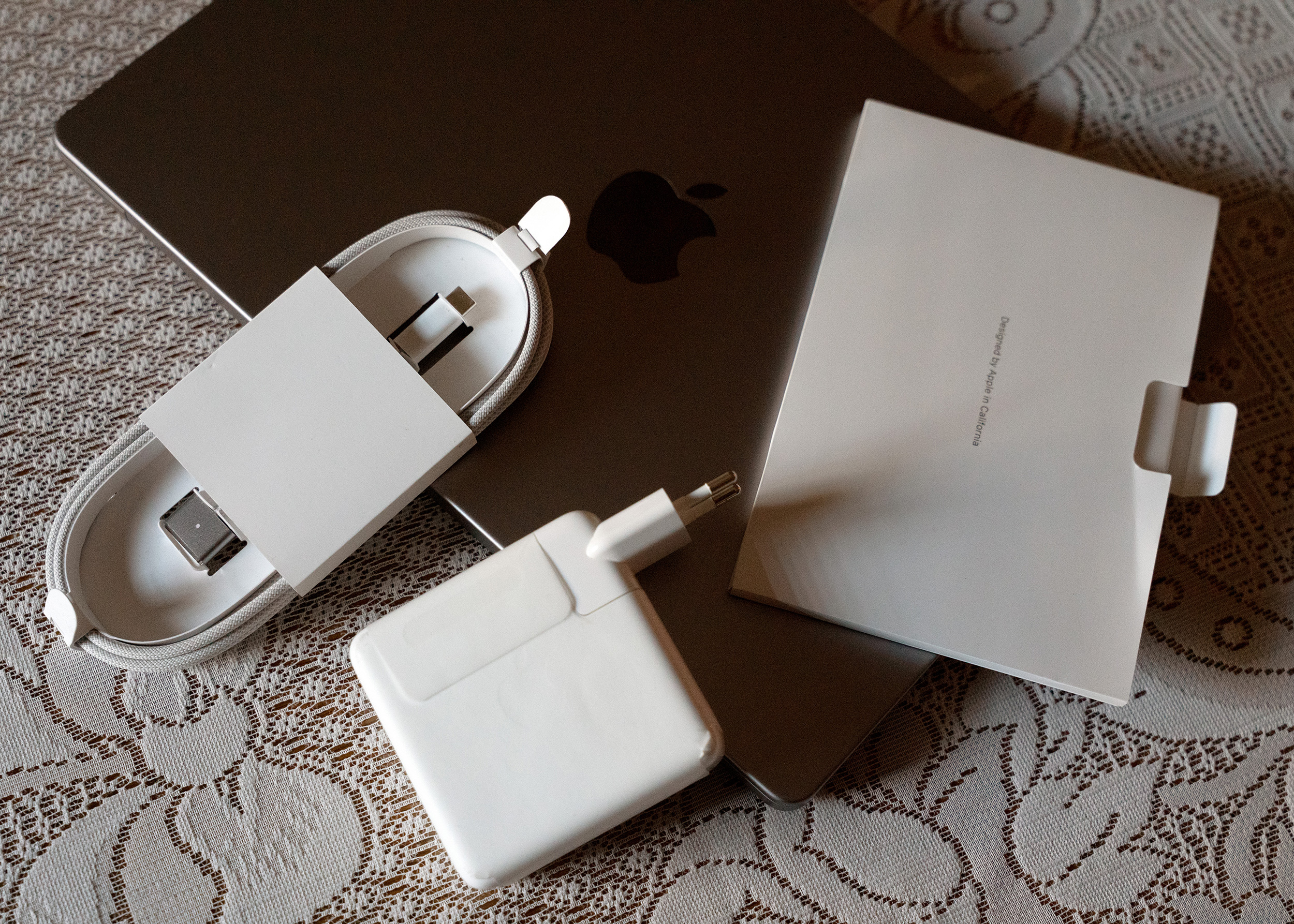Se incluye cargador original 96W USB‑C sin uso, su cable original también sin uso, y la documentación/sticker negros que venían en la caja.